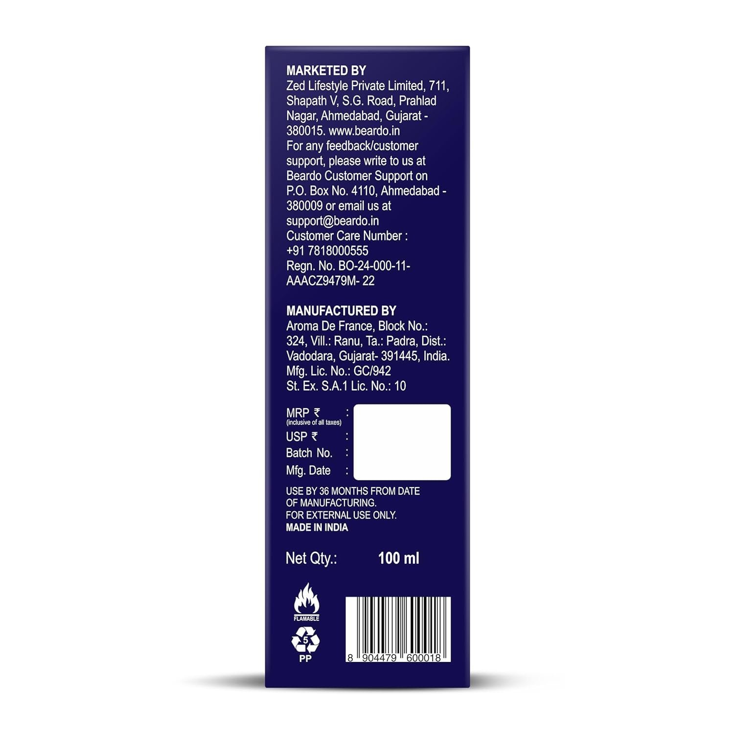 Manufacturer 324 Vill. Ranu, Ta. Padra, Dist. Vadodara, Gujarat-391445, INDIA. Mfg.Lic. No.:, Aroma De France