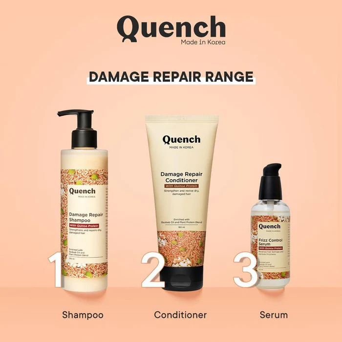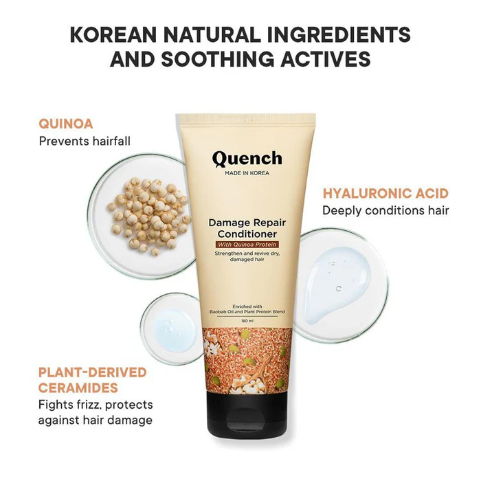 Damaged hair means dry, frizzy, weak and brittle hair, which is why our intensive care Damage Repair Conditioner is here to help smooth things out. This deep conditioning formula is a treasure trove of natural Korean ingredients and superfoods. The star of our formula, quinoa protein, works wonders to revive and strengthen damaged hair, infusing them with shine and bounce, while baobab oil and our hydrolyzed plant protein blend to treat split ends, breakage, frizz, and prevent hair fall and damage. And it gets even better with a boost of hyaluronic acid and plant-derived ceramides that lock in hydration, minimises breakage and wraps each strand in a protective shield, keeping damage from sun exposure, heat styling, and chemical treatments at bay. Oh, did we mention that this quinoa hair conditioner is free of silicones, paraben and sulphates, making it a true superhero in rescuing intensely dry, frizzy and damaged hair? So if you’re ready to experience softer, smoother and damage-free hair, add this to your wash day now!