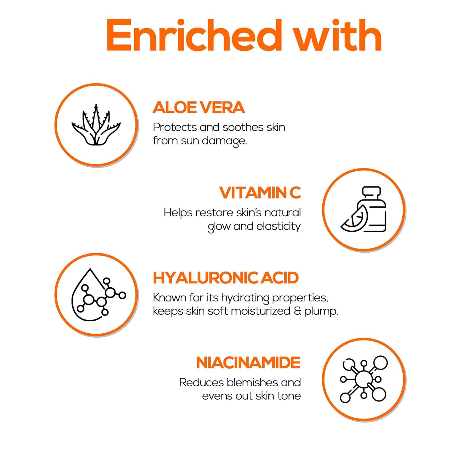 - Enriched with Vitamin C, Niacinamide, Aloe vera extract, Hyaluronic acid – RENEE Glowscreen sunscreen is power packed with renowned skin benefiting ingredients like Vitamin C and Hyaluronic acid which keep your skin moisturized and nourished along with shielding it from sun rays.