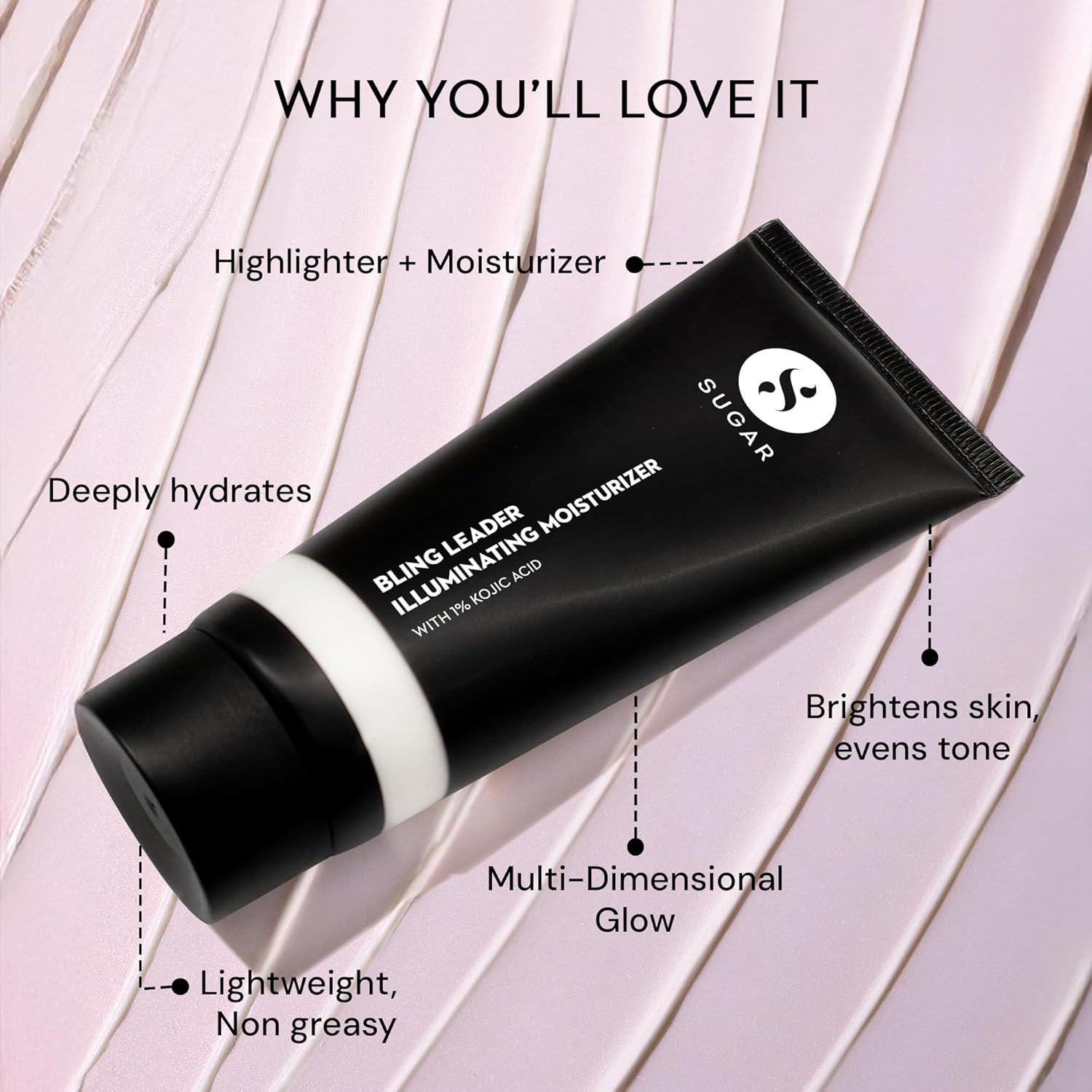 Ready to glow like you mean it? Cue: SUGAR Bling Leader Illuminating Moisturizer. This 2-in-1 skin saviour is powered by 1% Kojic Acid to hydrate and brighten your skin. It melts into your skin, giving you that lit-from-within look without the grease. Lightweight? Check. Blends quickly? Double check. Say goodbye to dullness and hello to bright, even-toned, dewy skin!