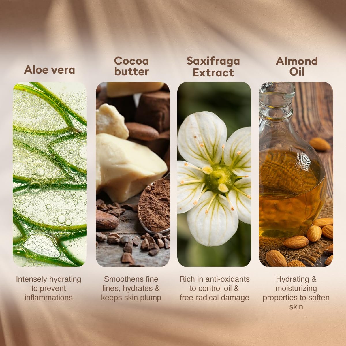 | Active Ingredients | Shea butter, Cocoa butter, Almond oil, Sunflower seed oil, Olive oil and extracts of Aloe vera, Saxifraga, Grape fruit, Mulberry root and Scutellaria.Shea butter, Cocoa butter, Almond oil, Sunflower seed oil, Olive oil and extracts of Aloe vera, Saxifraga, Grape fruit, Mulberry root and Scutellaria. |
