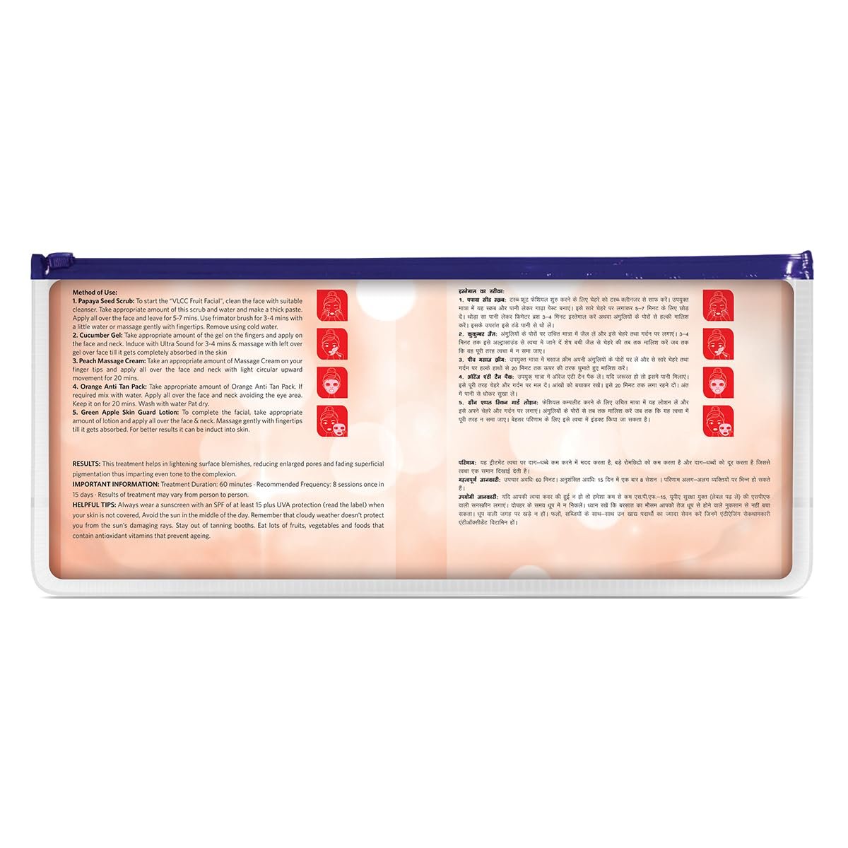 - VLCC Fruit Facial Kit is formulated with fruit and vegetable extracts like watermelon, peach, orange, and cucumber, along with Papaya, this Fruit Facial Kit helps achieve a blemish-free, radiant complexion.